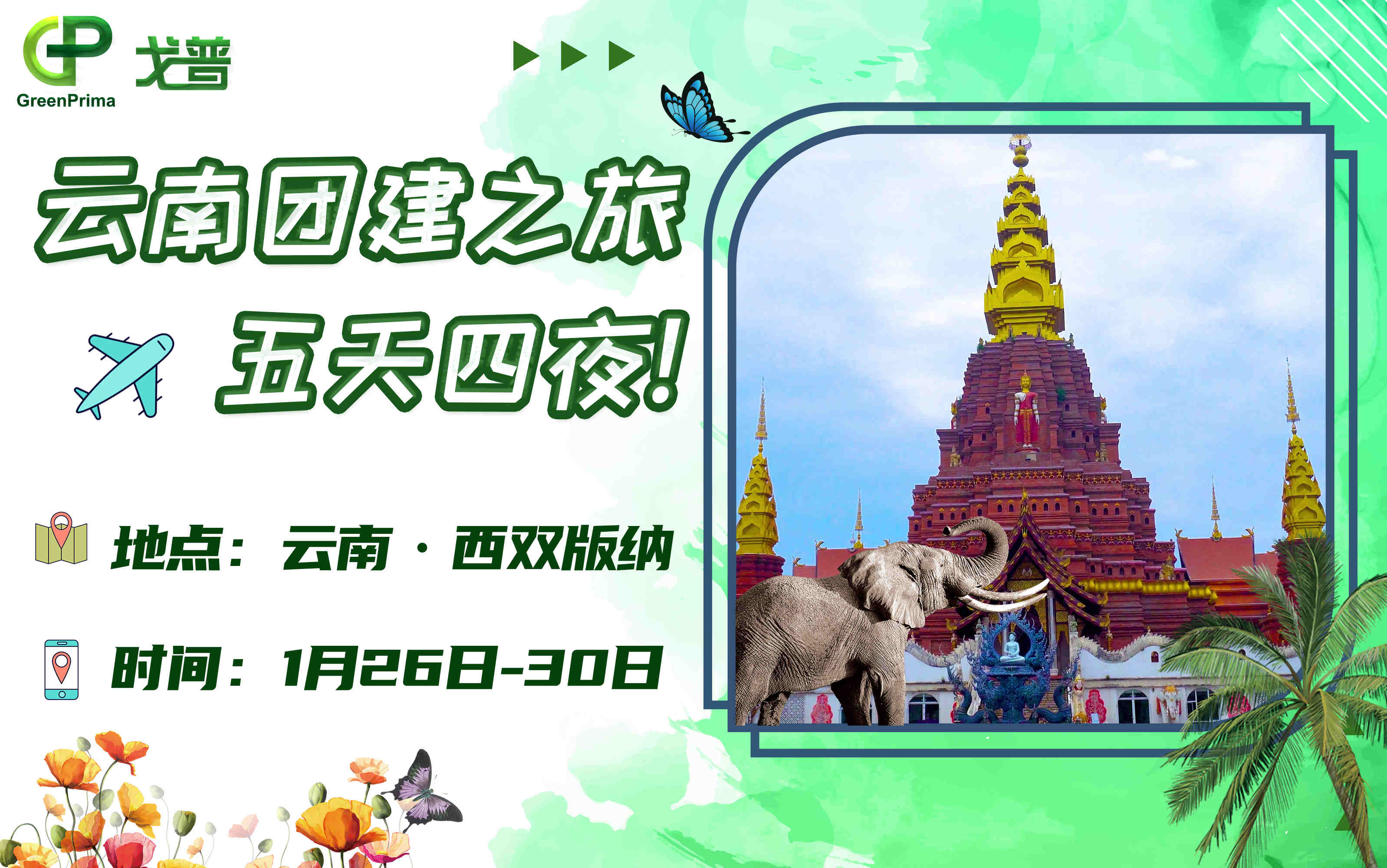 戈普公司將于2024年1月26至30日進行五天四晚的西雙版納團建活動,請各位同仁安排好手頭工作,向快樂出發!